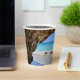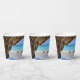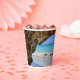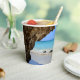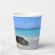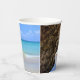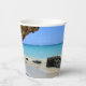 Paper cups with a scenic nature photograph. Beautiful turquoise blue sea with a sandy beach. A big brown rock provides some shade from the bright blue sky.