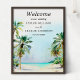 This elegant and beautiful watercolor wedding welcome sign features a beach, blue sky and palm trees. The text combines handwritten script and sans serif fonts for a stylish and modern look. This is perfect for a summer beach or tropical destination wedding.