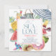 This cute "all I sea is love" bridal shower invitation features a white background with a beach umbrella, flip flops, tropical mason-jar drink/cocktail, popsicle, watermelon, donut, pineapple, straw hat, fresh coconut drink, pinwheel and sunglasses. The reverse side features a white background with pink stripes. Personalize it for your needs. You can find more matching products at my store.