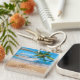 Keychain shown with a photo print of a beautiful tropical beach scene.