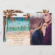 A beautiful watercolour sea and sand beach scene, with a palm trees and string lights design save the date photo invitation. It has typography wording "save the date". Easy to edit or delete the available text fields to personalise the information with your own details, and add a special photo for a professional and custom finish. Lots of matching items in this boho collection. Please visit my shop to see the full range. Invitations, stickers and address labels also available.