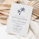 This simple minimal tropical beach wedding invitation features two palm trees at the top, with classic elegant text, in a white and navy blue color scheme, with coordinating navy blue on the back.