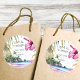 Tropical beach hibiscus wedding favour template stickers, watercolor beach pink hibiscus blooms palm leaves for destination beach weddings thank you favour stickers with bride and groom names