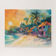 A John Dyer inspired tropical beach paradise, the setting sun and beach homes overlooking the waters. This watercolor painting is detailed yet minimalistic.