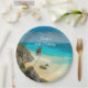 Paper plates with a beautiful photo featuring Tulum, Mexico. Turquoise waters on a sandy shore. Wind swept palm trees blowing in the breeze near a craggy cliff side. Soothing and relaxing.