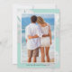 This tropical beach photo sea glass beach wedding invitation features two photos - one on the front over a trio of tropical white sand dollars and elegant hand lettered calligraphy script on a sea glass green background, and another photo on the back with your wedding website, leading your guest to more information regarding your wedding. A wonderful way to invite your guests to your tropical, nautical, seaside or oceanfront wedding in Hawaii, Florida, California, Mexico, or other destination wedding location. Photographs of the sand dollars and design © by T.K. Goforth, all rights reserved.