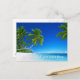 Postcard shown with a photo print of a beautiful tropical beach. Wish you were here...