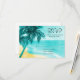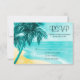 A trendy beach RSVP response card featuring palm trees on a beach. Shown in shades of teal blue and orange.