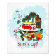 A fun and modern illustration of a tropical beach scene with palm trees, oceans surf with surfers, a beautiful bikini clad woman, beautiful flowers and an old hippy van bus. Great design for the beach lover.