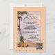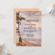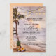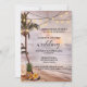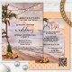 A romantic wedding invitation featuring a tropical beach at sunset with string lights in palm trees and a pineapple with flowers. On the back is a QR code template (optional). Beautiful for a destination wedding.