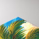 Bright tropical beach scene with vivid sunrise, turquoise waves, and vibrant flowers under swaying palm trees, creating a peaceful and dynamic paradise setting.