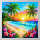 Vibrant tropical shore featuring a stunning sunset, turquoise waves, and lush flowers in vivid colours. Perfect for evoking relaxation, summer vacations, and serene natural beauty.