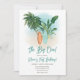 Tropical beach surf board the big one birthday invitation featuring exotic palm trees, bird of paradise watercolor illustration and a destination tropical beach with sand and turquoise blue ocean, with 2 surf boards in brown boho wood and turquoise with a cool font brush script. Perfect for spring and summer kids party invitation