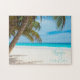 Beautiful tropical beach paradise with turquoise sea & palm tree towering over stunning white sand. Dream of relaxing and enjoying this idyllic scene as you piece together this tantalizing Jigsaw Puzzle. Easy to customize with your own name, initial & brief text in decorative font typography.