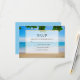 Wedding RSVP card with a landscape photograph of a tropical beach. White sand, azure water and blue sky with tropical leaves along the top.