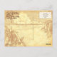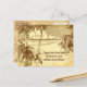 A custom return address postcard with a vintage etching of palm trees on a sandy beach and beautiful clouds over calm ocean waves, on a faux parchment background.
