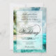 This beautiful wedding invitation features a beautiful watercolor landscape background of a tropical beach with palm trees and pristine ocean waters. It includes fancy script lettering with an elaborate flourish decorating the word "wedding". Simple, stylish, and glam, this invitation is a lovely way to invite your friends and family to share in your joy on your special day. The cool hues of teal, turquoise, aqua, blue, and green make it perfect for an island or coastal ceremony.