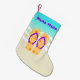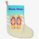 Customise this tropical flip flops stocking with your own name or as s gift. Stocking features a pair of orange polka dotted flip flops on a sandy beach with aquamarine beach waves.