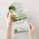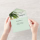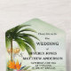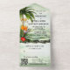 All in one wedding invitation featuring a tropical beach design in pretty green and teal colours. The RSVP part of this invitation has a QR code template to which you can easily add a URL to your own website. Alternately your guests can tear off that part of the invitation to fill out their information and mail it to you. You can also use this area to add information about accommodation or directions if you like.