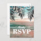 Beach destination wedding response cards featuring a tropical palm beach setting, string twinkle lights, and a rsvp postcard template.