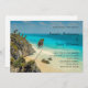 Wedding invitation with a beautiful photo featuring Tulum, Mexico. Turquoise waters on a sandy shore. Wind swept palm trees blowing in the breeze near a craggy cliff side. Soothing and relaxing.