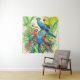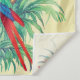 Tapestry in vividly coloured tropical birds surrounded by lush green foliage and vibrant flowers. The birds display brilliant shades of red, blue, yellow, and green. The scene depicts exotic beauty and rich botanical detail.