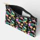 A toucan bird, a pink flamingo, and a bright pineapple combine with an ice cream cone, ice cream bars, a bright grapefruit slice, and a lemon, along with gold stars and green palm leaves to form a fun tropical pattern on the front of this bag. The multi coloured, bright images are placed on a dramatic black background. Your two letter monogram is in pink on the back, along with an image of the flamingo, palm leaf, and pineapple. Bright, colourful and fun!