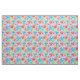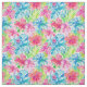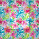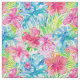 A seamless watercolor-style pattern featuring pink Hawaiian hibiscus flowers, blue monstera leaves, and palm tree leaves on a white background with pink dots. The design blends vibrant tropical elements with delicate dots to create a fresh and whimsical visual effect.