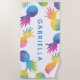 Tropical style beach towel features a vibrant border of rainbow coloured pineapples with a watercolor tie-dye gradient look. Personalise the modern blue custom text with a monogram of your first or last name.