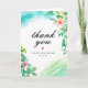 Pink coral flowers are nestled in bright green tropical leaves to create a contemporary botanical frame on this wedding thank you note. Blue and green watercolor washes in two corners given an open and airy quality. Thank you is written in elegant calligraphy, while your names and wedding date are in a classic serif text. A heart is placed in the centre of the text. This wedding thank you card is part of the Tropical Botanical collection. It contains DIY templates that you can use to create chic wedding stationery. You should see a link to it on this page. If you don't see the link or you need help with an item, please contact me.