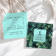 Elegant hairstylist or salon business cards with a chic tropical island vibe feature a background of vibrant green jungle botanical leaves. Personalise the front with your name or business name beneath a pair of stylist's scissors, and add your full contact information to the back in modern black lettering on a beachy light turquoise aqua background.