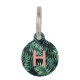 Tropical chic ID tag for your furbaby features a single initial monogram in vibrant beachy coral, on a pattern of green botanical jungle leaves on a black background. Personalize with your pet's name and your contact details on the reverse side.