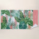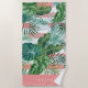 Add tropical flair to your beach or pool days with this cool botanical printed beach towel in beachy shades of green, coral and white. Design features a pattern of green banana leaves, monstera, and palm fronds overlaid on preppy coral and white stripes. Personalise with an individual name, family name, or monogram along the bottom in classic white lettering.
