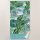 Add tropical flair to your beach or pool days with this cool botanical printed beach towel in beachy shades of green, turquoise and white. Design features a pattern of green banana leaves, monstera, and palm fronds overlaid on aqua and white stripes. Personalise with an individual name, family name, or monogram along the bottom in classic white lettering.