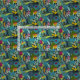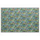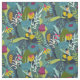 A bright tropical floral pattern in shades of blue, green, gold and pink.
