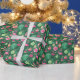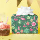 Green tropical Christmas gift wrap with ornaments like flamingos or tropical fruit. The gold glitter used in this print is simulated, not real glitter. Original artwork by Marketa Stengl.