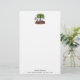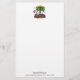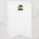 Stationery paper with a seasonal holiday image. A tropical palm tree decorated in festive lights with a star on top. A giant red and white candy cane sticking out of the sand. Christmas presents under the tree. Whimsical and fun.