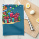 A kitchen towel with a seasonal holiday image. A tropical palm tree decorated in festive lights with a star on top. A giant red and white candy cane sticking out of the sand. Christmas presents under the tree. Whimsical and fun.