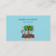Business card with a seasonal holiday image. A tropical palm tree decorated in festive lights with a star on top. A giant red and white candy cane sticking out of the sand. Christmas presents under the tree. Whimsical and fun.