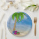 Tropical palm tree with Christmas ornaments and gifts in beach sand