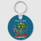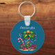 A keychain with a seasonal holiday image. A tropical palm tree decorated in festive lights with a star on top. A giant red and white candy cane sticking out of the sand. Christmas presents under the tree. Whimsical and fun.