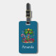 A luggage tag with a seasonal holiday image. A tropical palm tree decorated in festive lights with a star on top. A giant red and white candy cane sticking out of the sand. Christmas presents under the tree. Whimsical and fun.