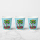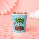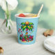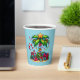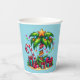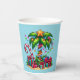 Paper cups with a seasonal holiday image. A tropical palm tree decorated in festive lights with a star on top. A giant red and white candy cane sticking out of the sand. Christmas presents under the tree. Whimsical and fun.