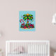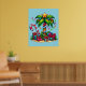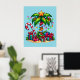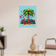 Poster with a seasonal holiday image. A tropical palm tree decorated in festive lights with a star on top. A giant red and white candy cane sticking out of the sand. Christmas presents under the tree. Whimsical and fun.