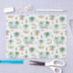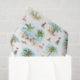 This festive tropical Christmas tissue paper features a pattern of holiday beach scenes with palm trees decorated with colourful strings lights and beach chairs overlooking the water, interspersed with pink flamingos in santa hats, and seagulls perched on decorated pilings.