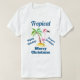 A men's t-shirt which says: Tropical Merry Christmas, Seasons Greetings, Happy Holidays. With a whimsical drawing of a pink flamingo wearing a red santa hat. Standing on a mound of yellow beach sand with a green and brown coconut palm tree in the back. Cute and fun festive tropical design.