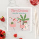 This custom Christmas holiday party napkin features a cute cartoon illustration. Two pink flamingos are having a party with gifts and Christmas lights. A cute little snowman is standing in front of a tropical palm tree. The background is a soft blush pink colour.