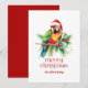 This festive tropical Christmas-themed design features- Merry Christmas -beautiful red retro typography with a tropical Christmas bird in a Santa hat.