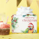 This festive tropical Christmas-themed design features- Merry Christmas -beautiful red retro typography with a tropical Christmas bird in a Santa hat.