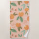 This beach towel features a colourful illustrated pattern of oranges, tropical flowers, and leaves on a light pink background.
